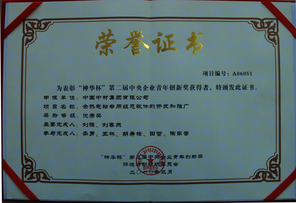 3月30日,“神華杯”第二屆中央企業青年創新獎表彰大會在國務院國資委隆重召開。國務院國資委主任、黨委書記李榮融為獲獎單位頒獎。中材節能報送的“余熱電站專用組態軟件的開發和推廣”項目獲得了優秀獎。